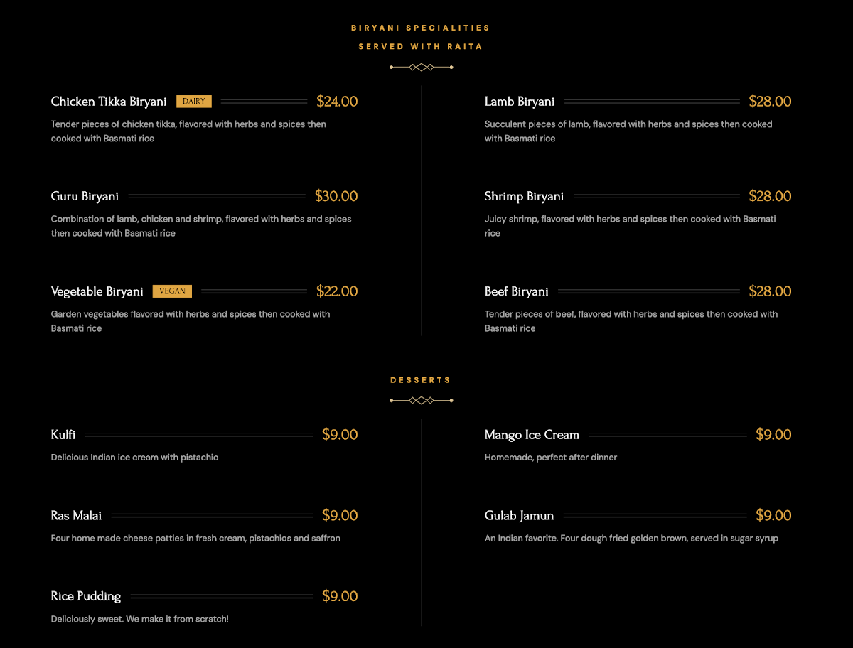 Drawing rave reviews from guests like Rachel Sims and Kaitlyn Oney, it's clear that the experience at Guru transcends just food. The butter chicken and garlic naan stand out for their exceptional taste and quality, showcasing the chef's mastery of rich spices and authentic recipes. Customers frequently express their delight with phrases like “bursting with flavor” and “delicious,” underscoring the restaurant's commitment to excellence in every dish.